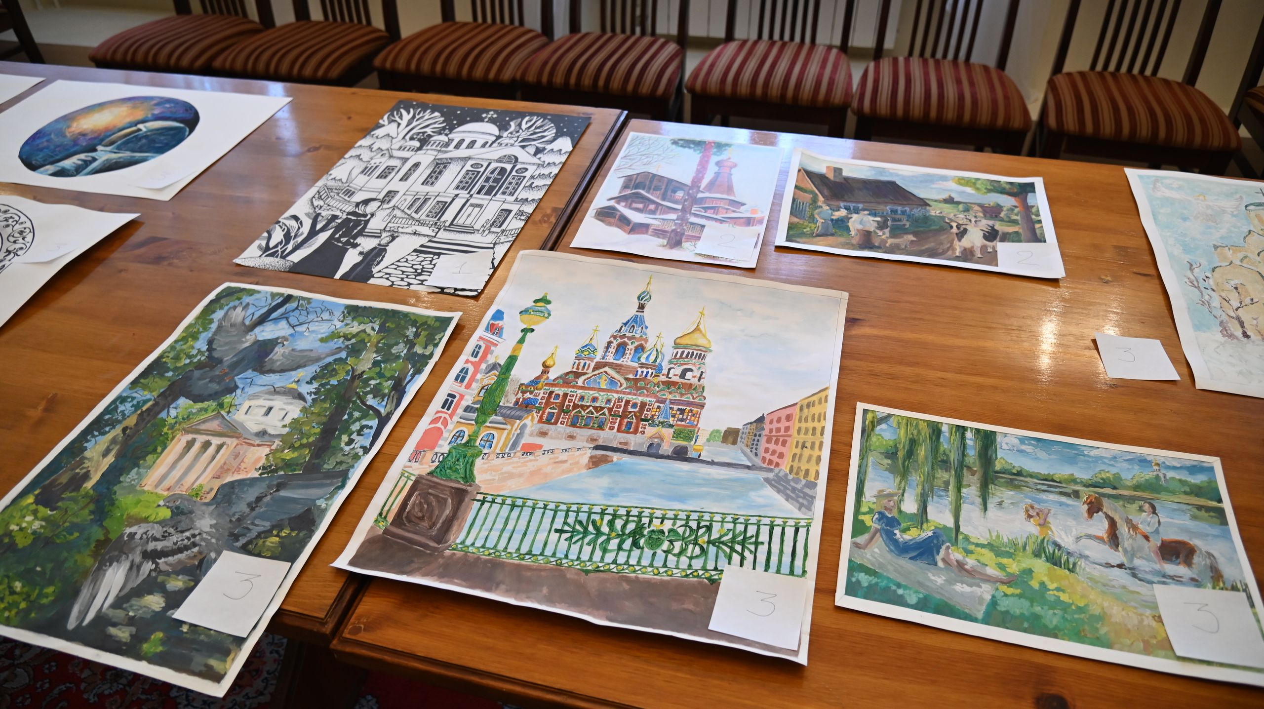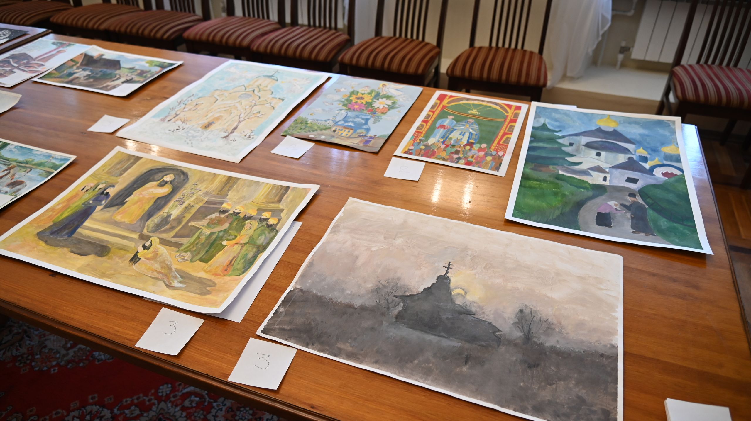 3 место: Рулёва София (11 лет) «Бабушкины молитвы», Спиридонова Алиса (12 лет) «Библейские сюжеты. Суд царя Соломона» и Галкина Емилия (12 лет) «Восход солнца».
