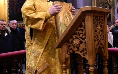 «Дорогие братья и сестры! Примите от нас, духовенства собора, поздравления с воскресным днём. Пусть дни, которые предшествуют великому событию Рождества Господа и Бога, и Спаса нашего Иисуса Христа, каждому из нас послужат во спасение.