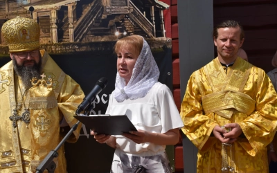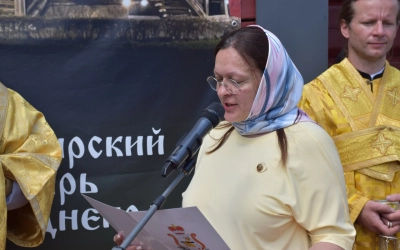 Первый заместитель министра культуры и туризма Смоленской области Ольга Петровна Романенкова зачитала Приветственное послание Губернатора Смоленской области Василия Николаевича Анохина в связи с 10-летием со дня основания Свято-Владимирского мужского монастыря на истоке Днепра .