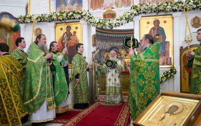 По окончании богослужения было совершено славление празднику, Святейший Владыка прочитал молитву преподобной Евфросинии Полоцкой.