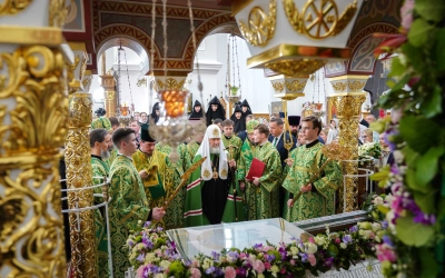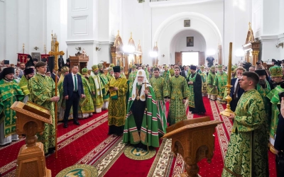 В соборном храме в честь Воздвижения Креста Господня Святейший Патриарх Кирилл поклонился мощам преподобной Евфросинии Полоцкой и возглавил служение Божественной литургии.
