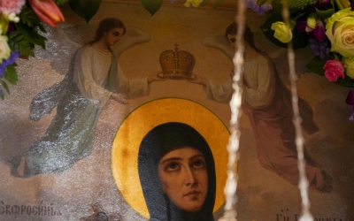 Также Предстоятеля Русской Церкви приветствовала настоятельница Спасо-Евфросиниевского монастыря игумения Евдокия (Левшук), которая преподнесла Его Святейшеству икону преподобной Евфросинии, написанную сестрами обители.