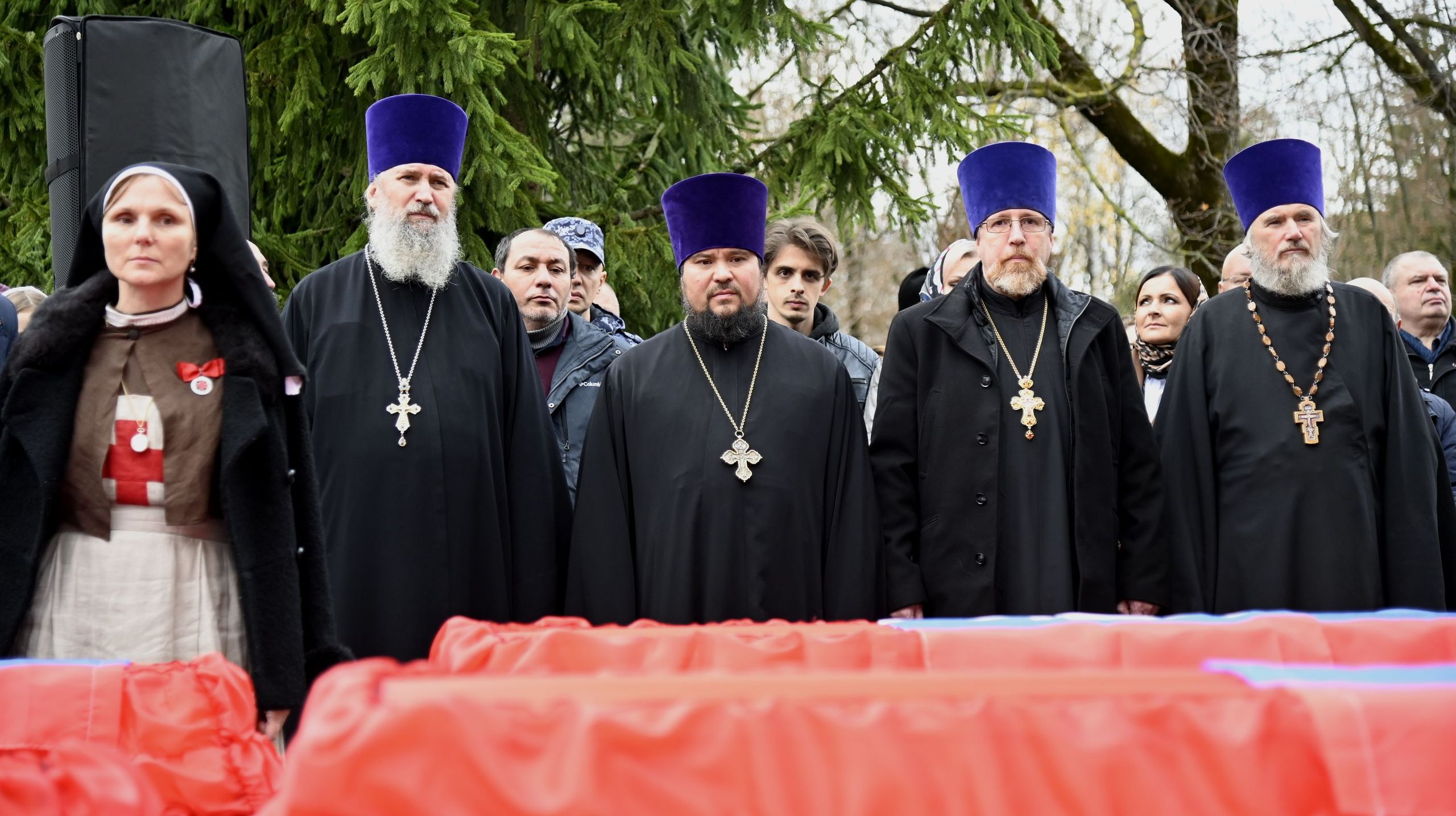 Затем на прилежащем к храму участке Братского кладбища состоялось перезахоронение останков русских воинов, умерших в смоленских госпиталях от ран, полученных на фронтах Первой мировой войны. Памятное мероприятие организовано в рамках реализации регионального проекта партии «Единая Россия» «Защитникам Отечества посвящается...».