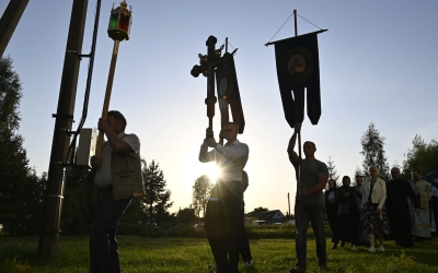 После Великого славословия Плащаница Пресвятой Богородицы была обнесена крестным ходом вокруг храма.