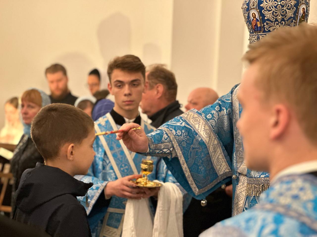 После чтения Святого Евангелия архипастырь обратился к молящимся с архипастырским словом и совершил помазание молящихся освященным елеем: