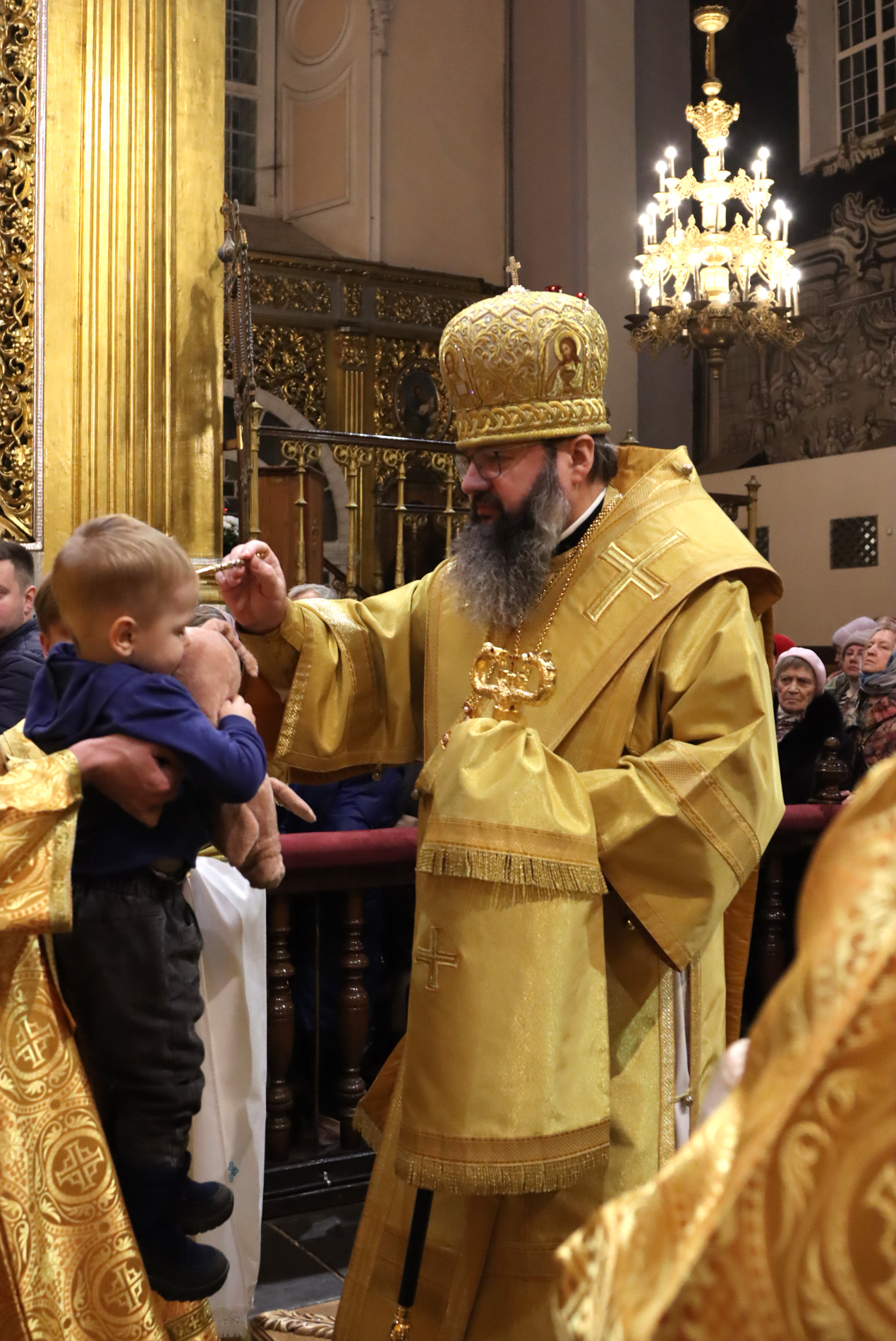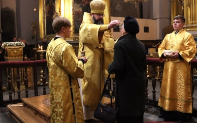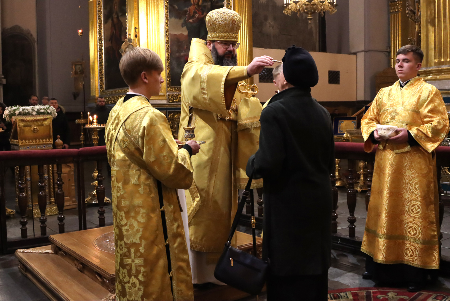 По завершении богослужения Высокопреосвященнейший Владыка преподал архипастырское благословение всем присутствующим, помазав их освященным елеем.