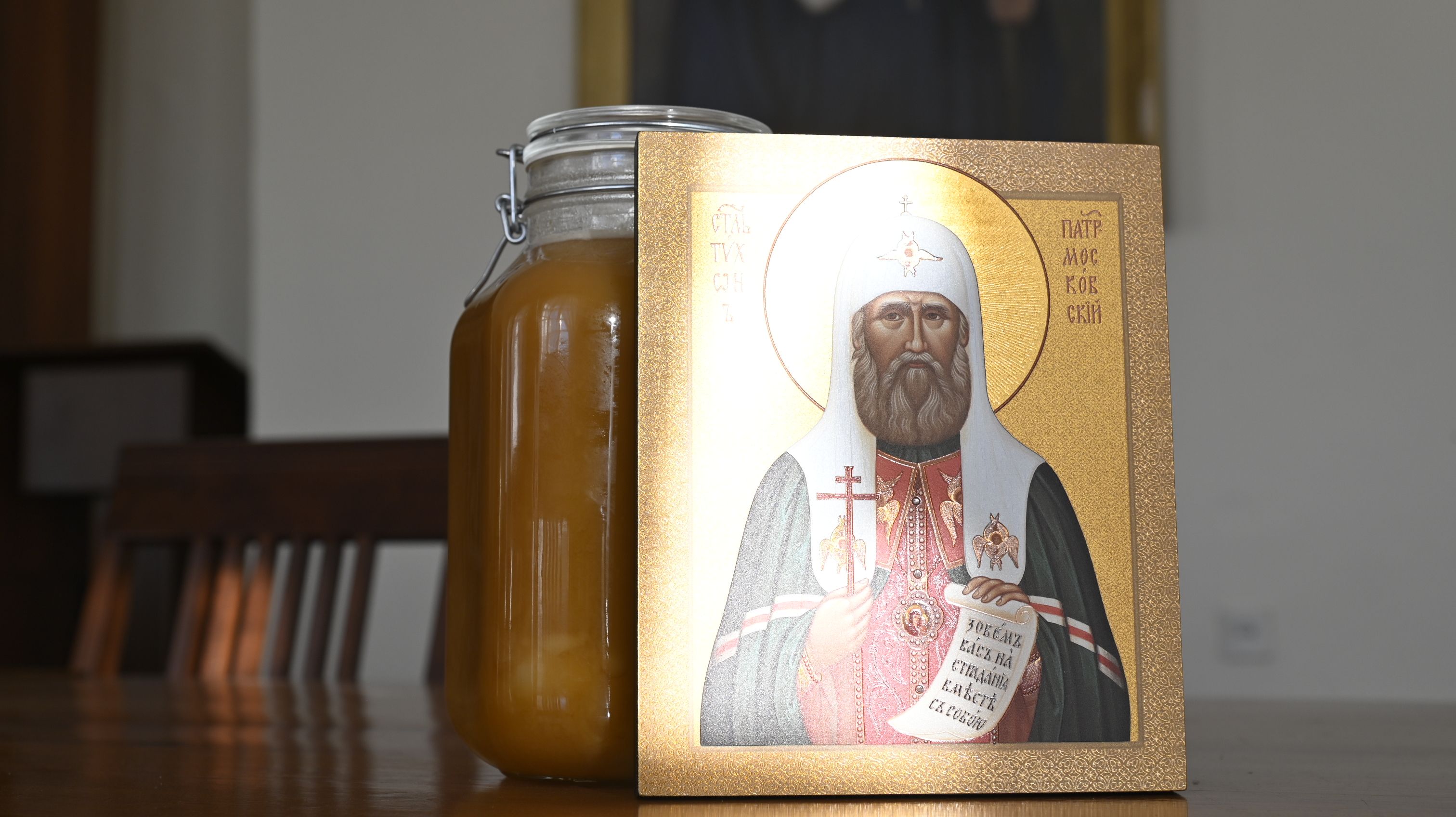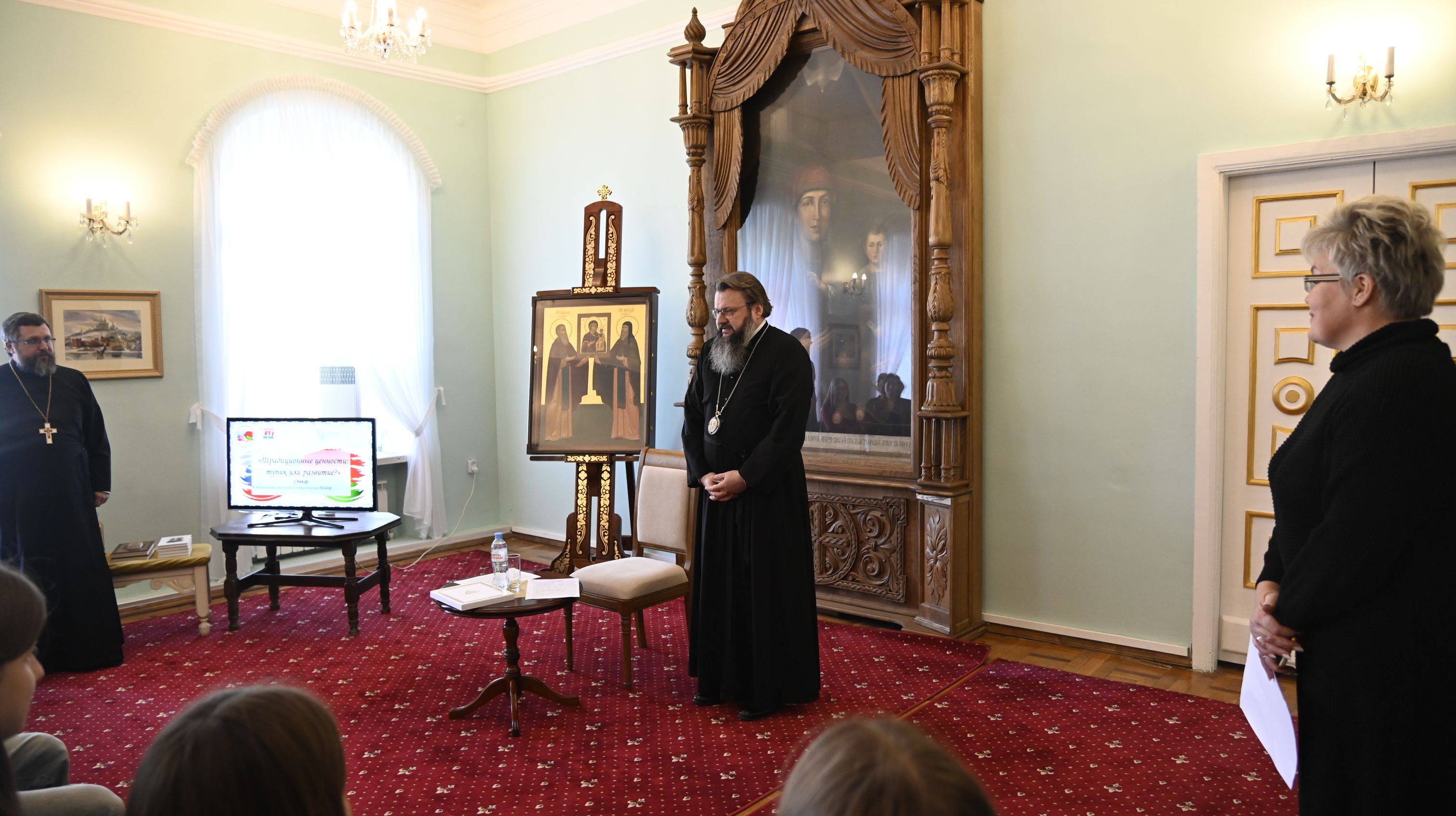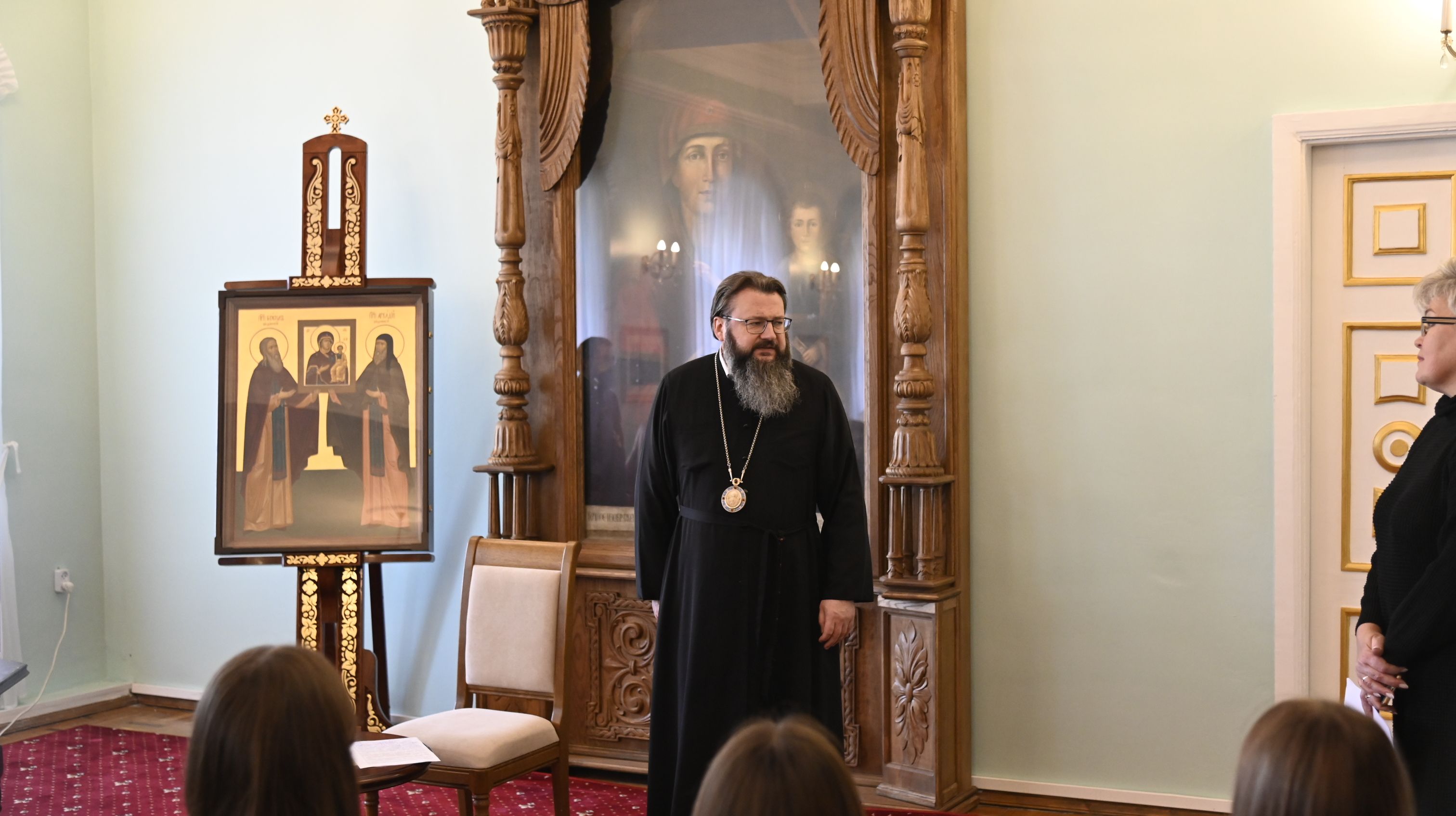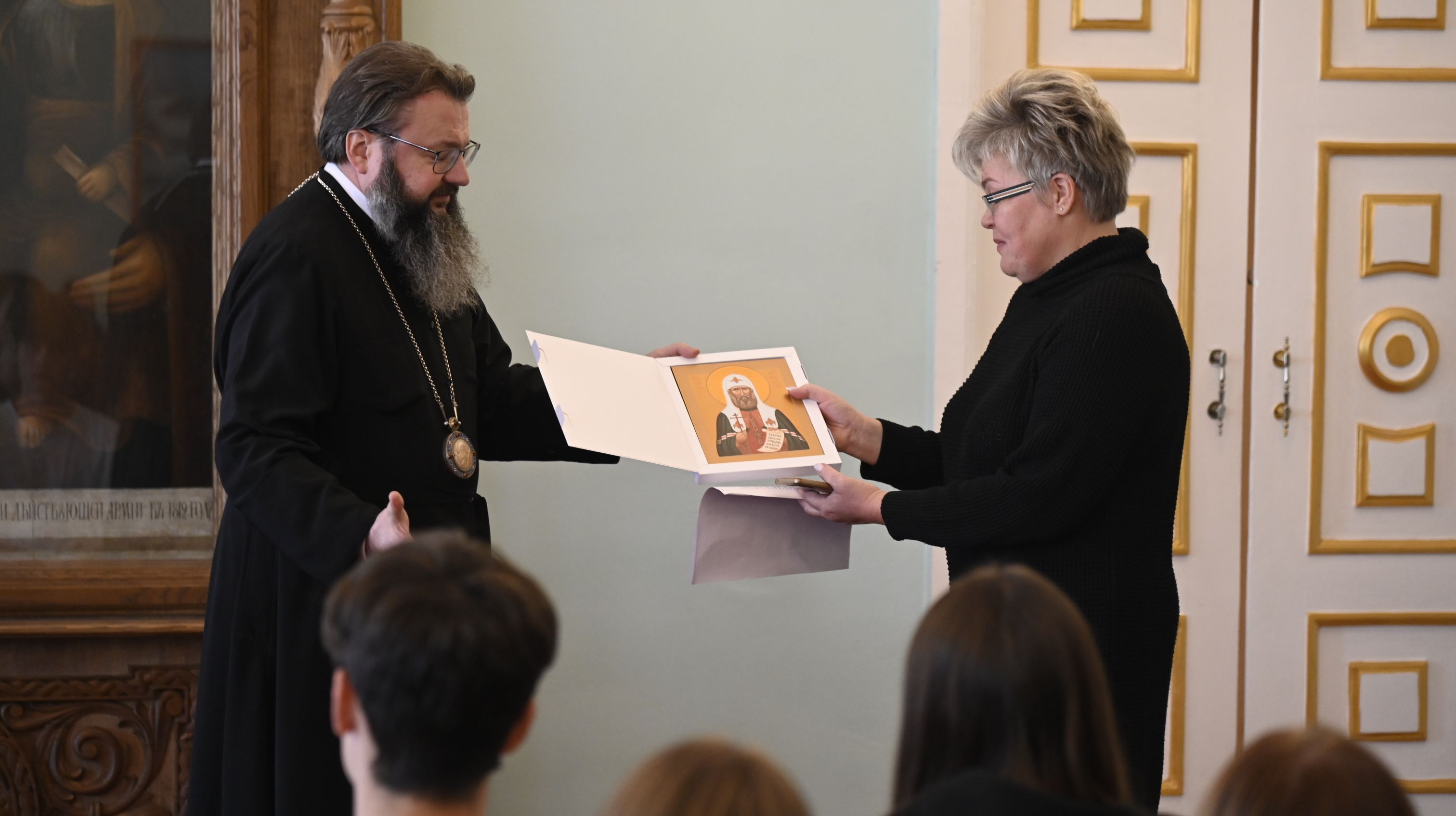 В начале встречи Владыка Исидор торжественно вручил руководителю проекта Анне Георгиевне Нагорной икону святителя Тихона, Патриарха Московского и вся России.