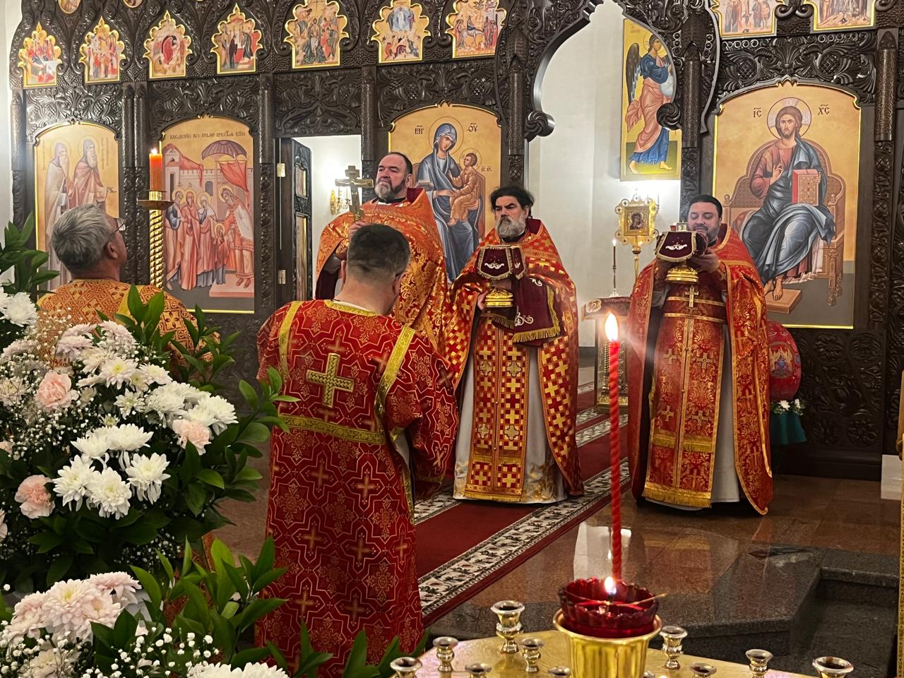 Его Высокопреподобию сослужили архимандрит Стефан и иерей Ступа. Праздничные песнопения исполнил хор Архейского подворья под управлением регентов Татьяны Нагиевой и Натальи Ишковой. Богослужение началось с общей исповеди.