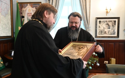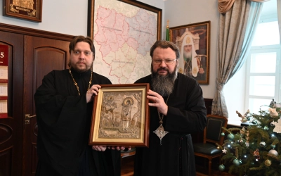 В знак архипастырского благословения Глава Смоленской митрополии передал отцу Дионисию старинную икону святого мученика Вонифатия, доставленную из Свято-Владимирского монастыря на Истоке Днепра.