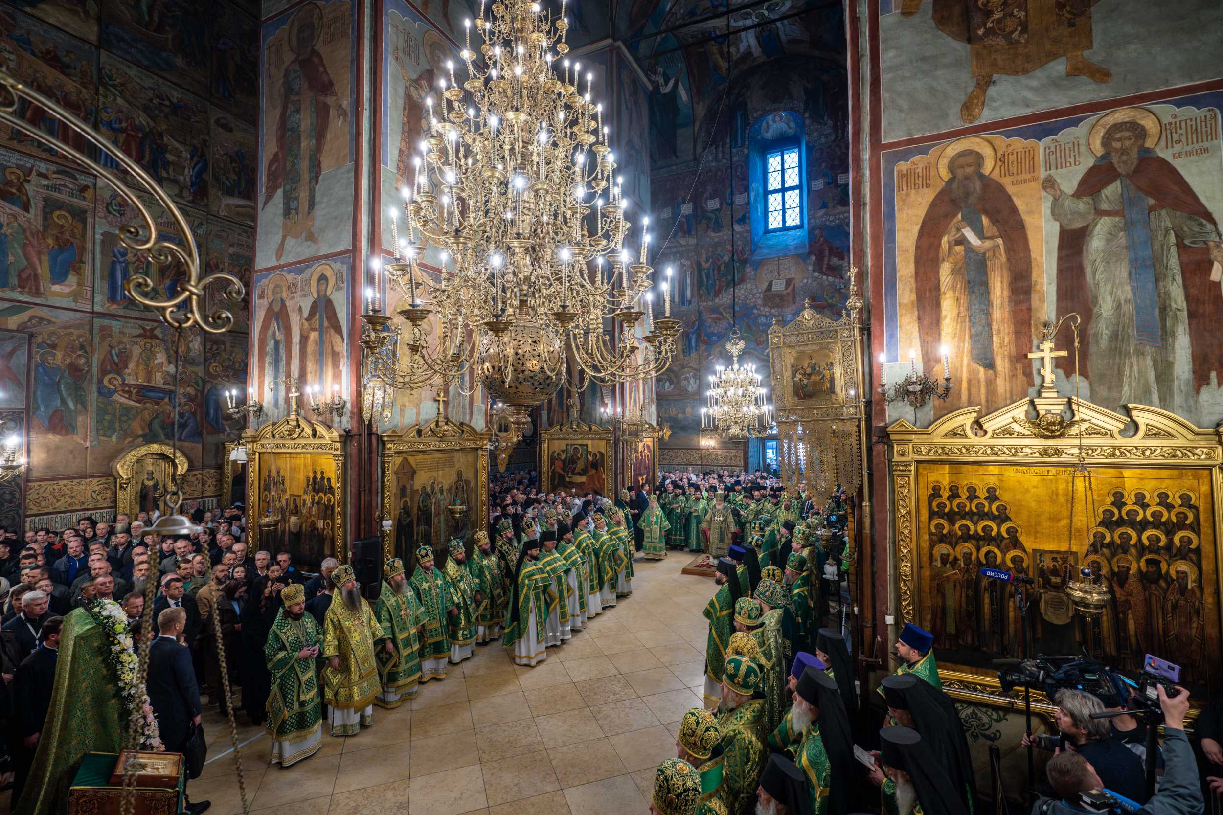 В соборе молились архиереи, настоятельницы женских монастырей, священнослужители, монашествующие и паломники, прибывшие на торжества в Троице-Сергиеву лавру.