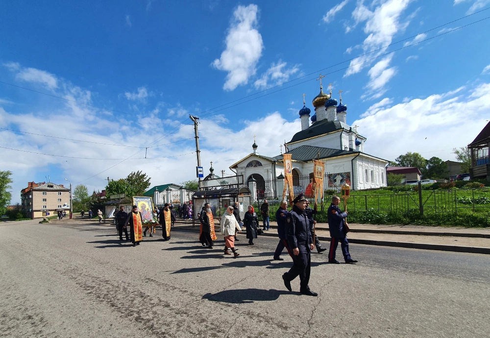 Затем духовенство и верующие совершили Крестный ход с чудотворным образом иконы Божией Матери Иверской в церковь в честь Введения во храм Пресвятой Богородицы г. Вязьмы.