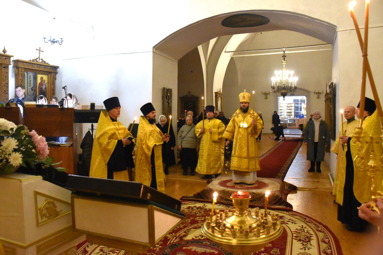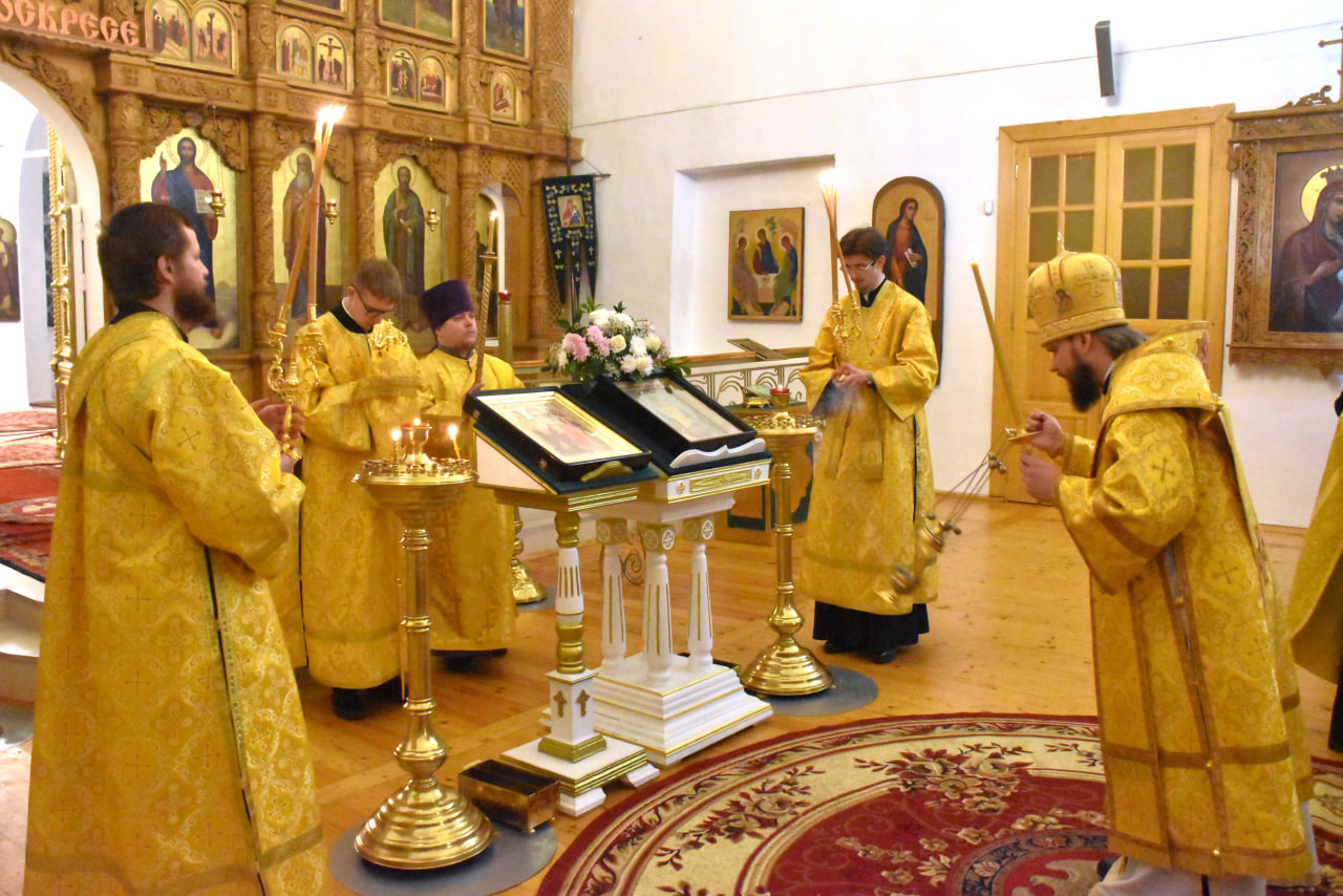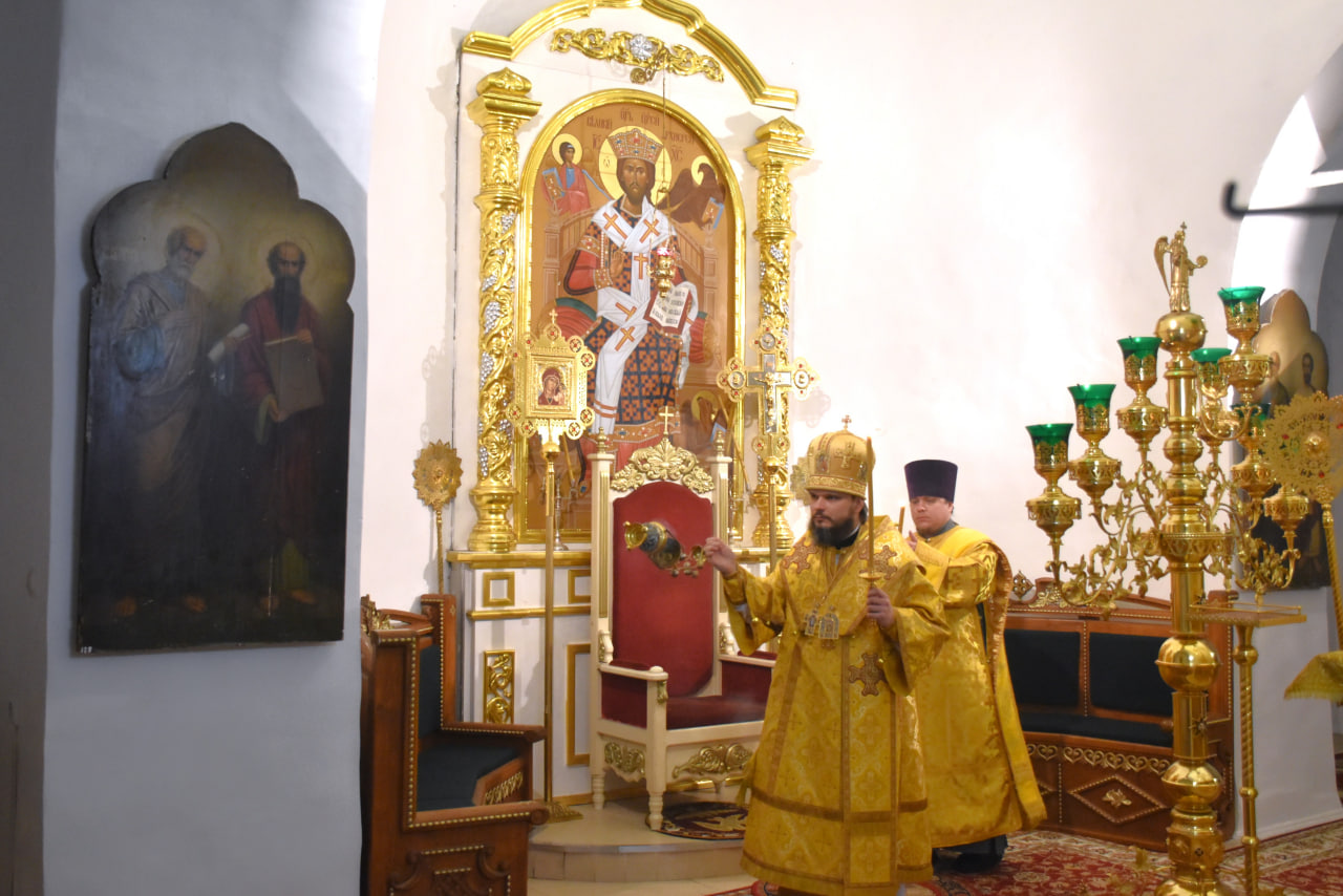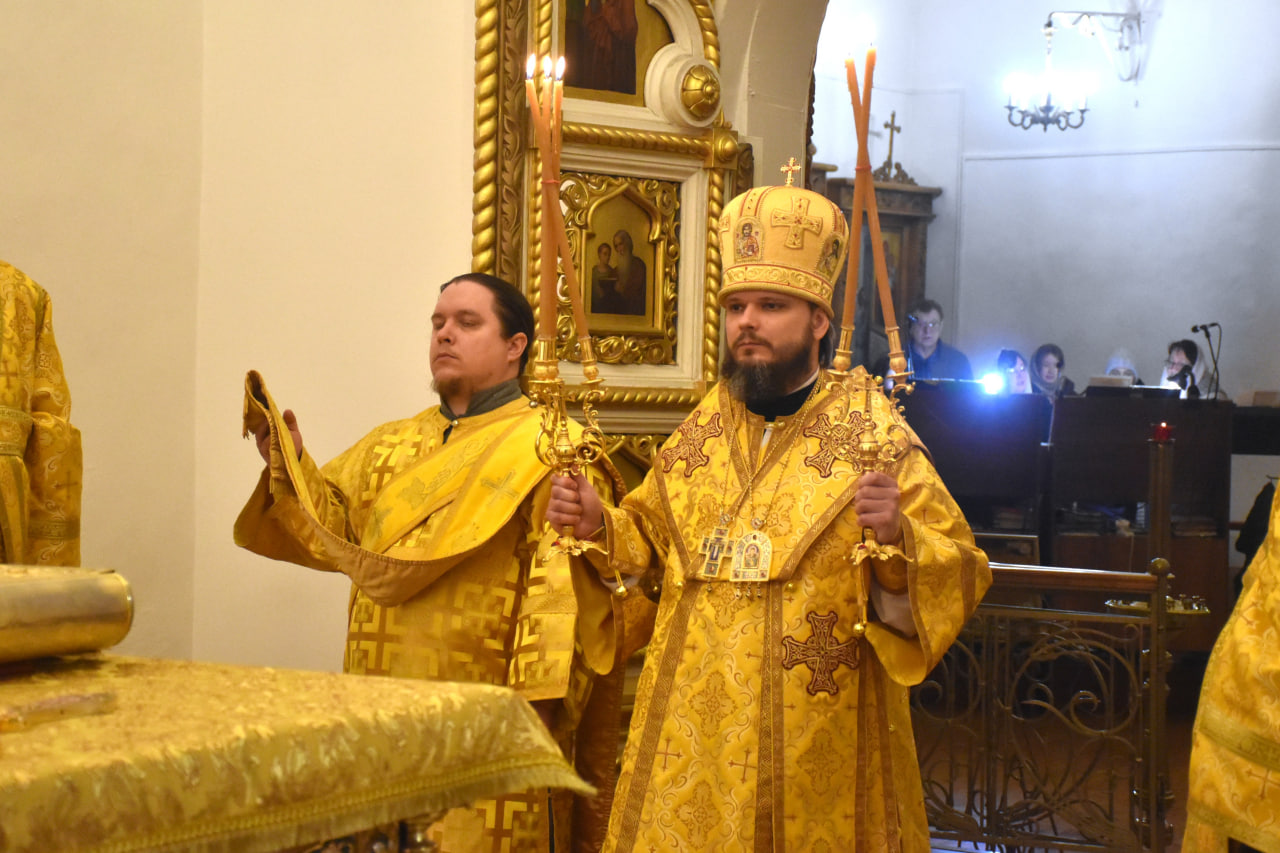 Его Преосвященству сослужили: настоятель Свято-Троицкого кафедрального собора иерей Александр Курмелёв, иерей Максим Мамонов, иерей Владимир Покатов, диакон Евгений Ткач.