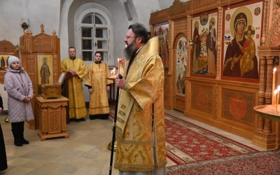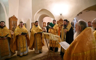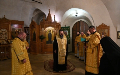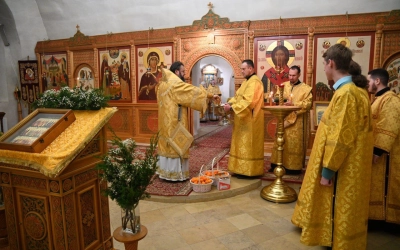 За Божественной литургией Его Высокопреосвященству сослужили наместник святой обители игумен Николай (Золотов), братия святой обители в священном сане.