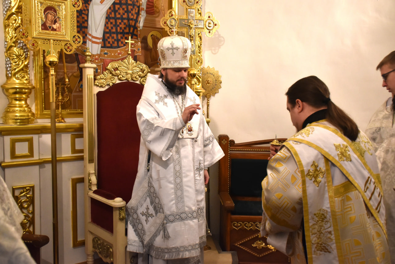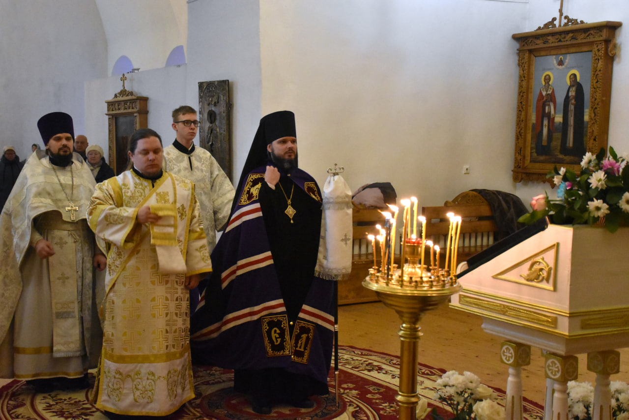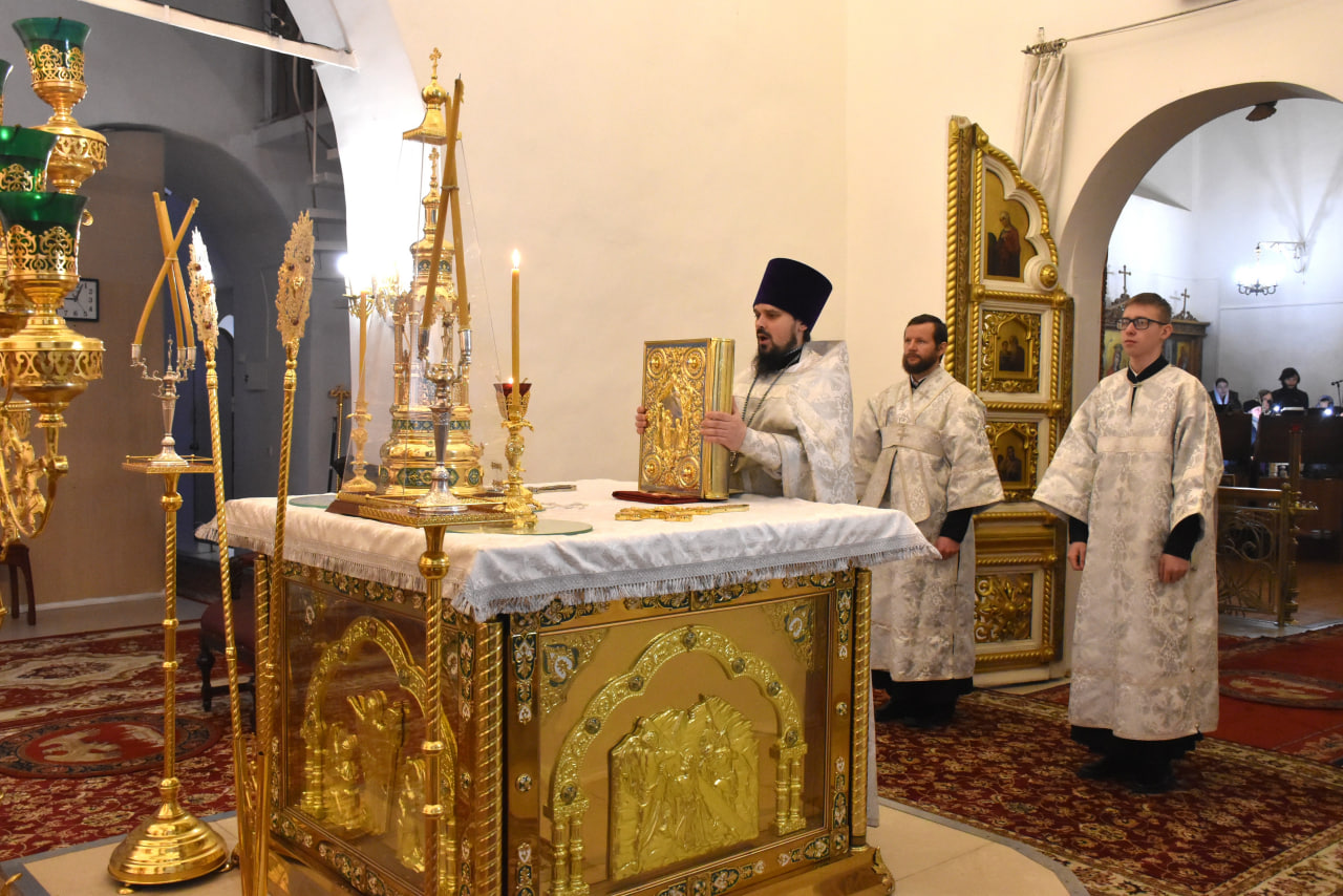 Архипастырю сослужили: настоятель Свято-Троицкого кафедрального собора иерей Александр Курмелёв, иерей Максим Мамонов, иерей Александр Жухарев и диакон Евгений Ткач.
