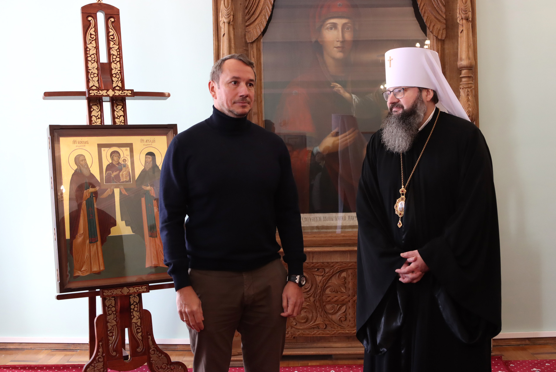 Так вот замечательно, что вы сегодня здесь, и я благодарю, дорогой отец Серафим, что Вы возглавили делегацию благочестивых мирян московских и прибыли сюда, в наш древний город, посетили храмы домонгольского периода. Вот и сегодня молились мы все вместе с вами в Успенском кафедральном соборе, также намоленном, также знаменитым. И вы имели возможность приложиться к Смоленской иконе Божией Матери «Одигитрии».