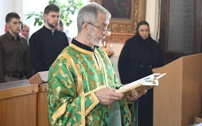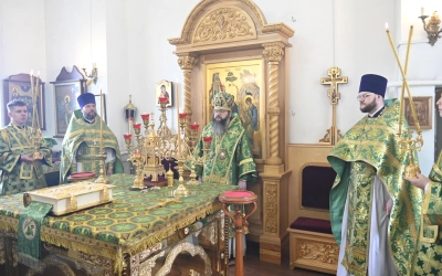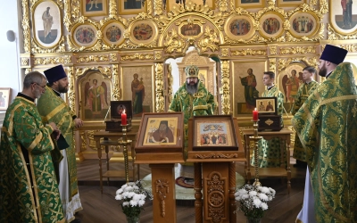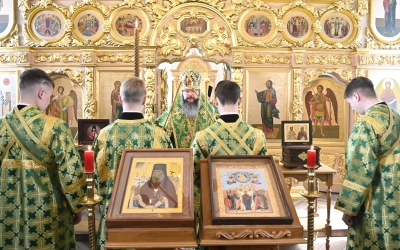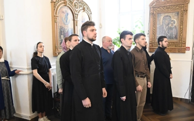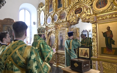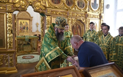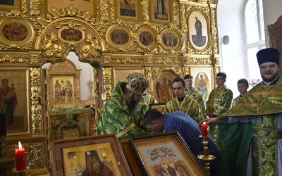 За богослужением молились участники Всероссийской научно-практической конференции, посвященной 25-летию канонизации прп. Макария Алтайского (Макария Глухарева) и 195-летию начала миссии Православной Церкви на Алтае, преподаватели и студенты СПДС, прихожане Покровского храма.