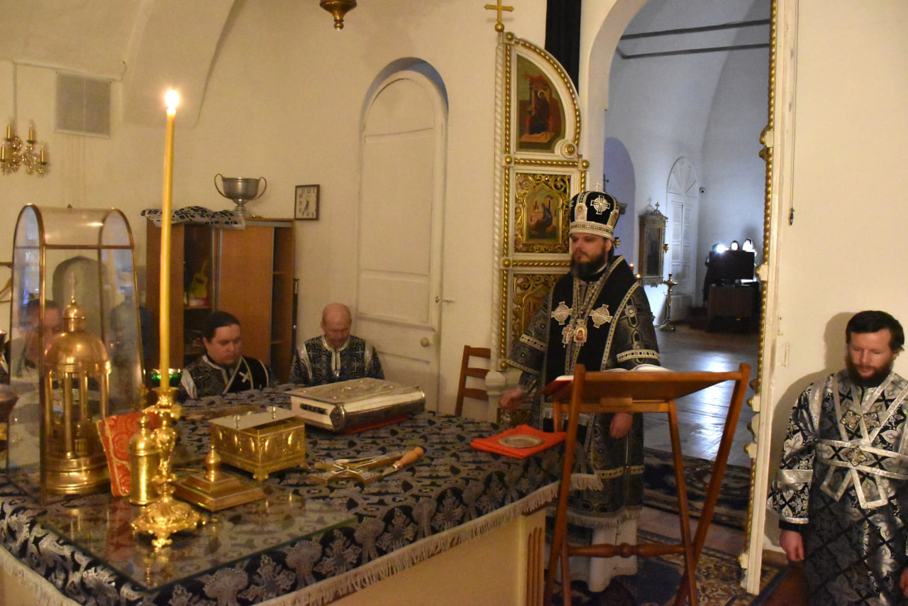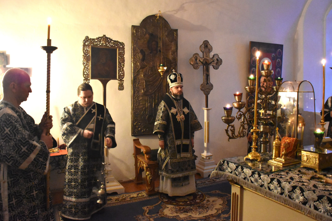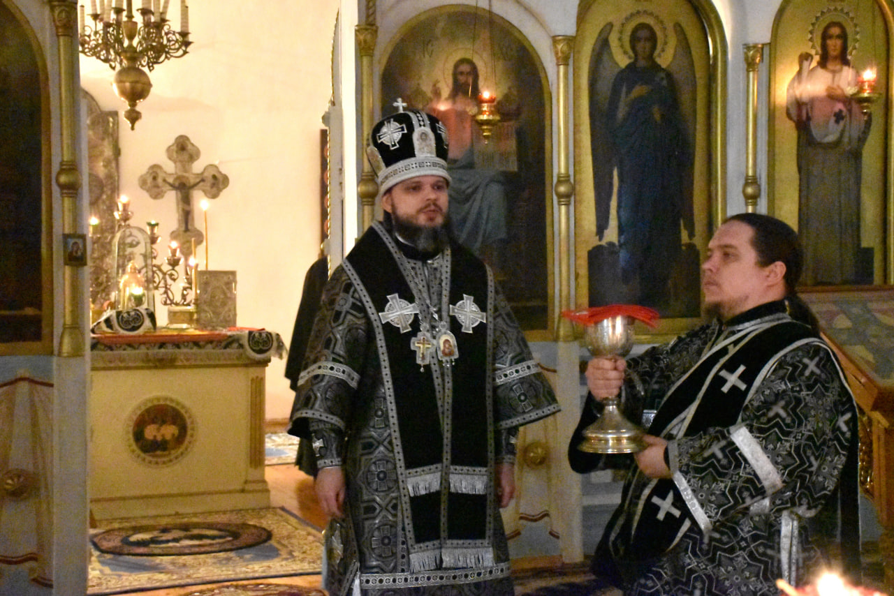 Его Преосвященству сослужили: настоятель кафедрального собора иерей Александр Курмелев, иерей Владимир Покатов, диакон Евгений Ткач.