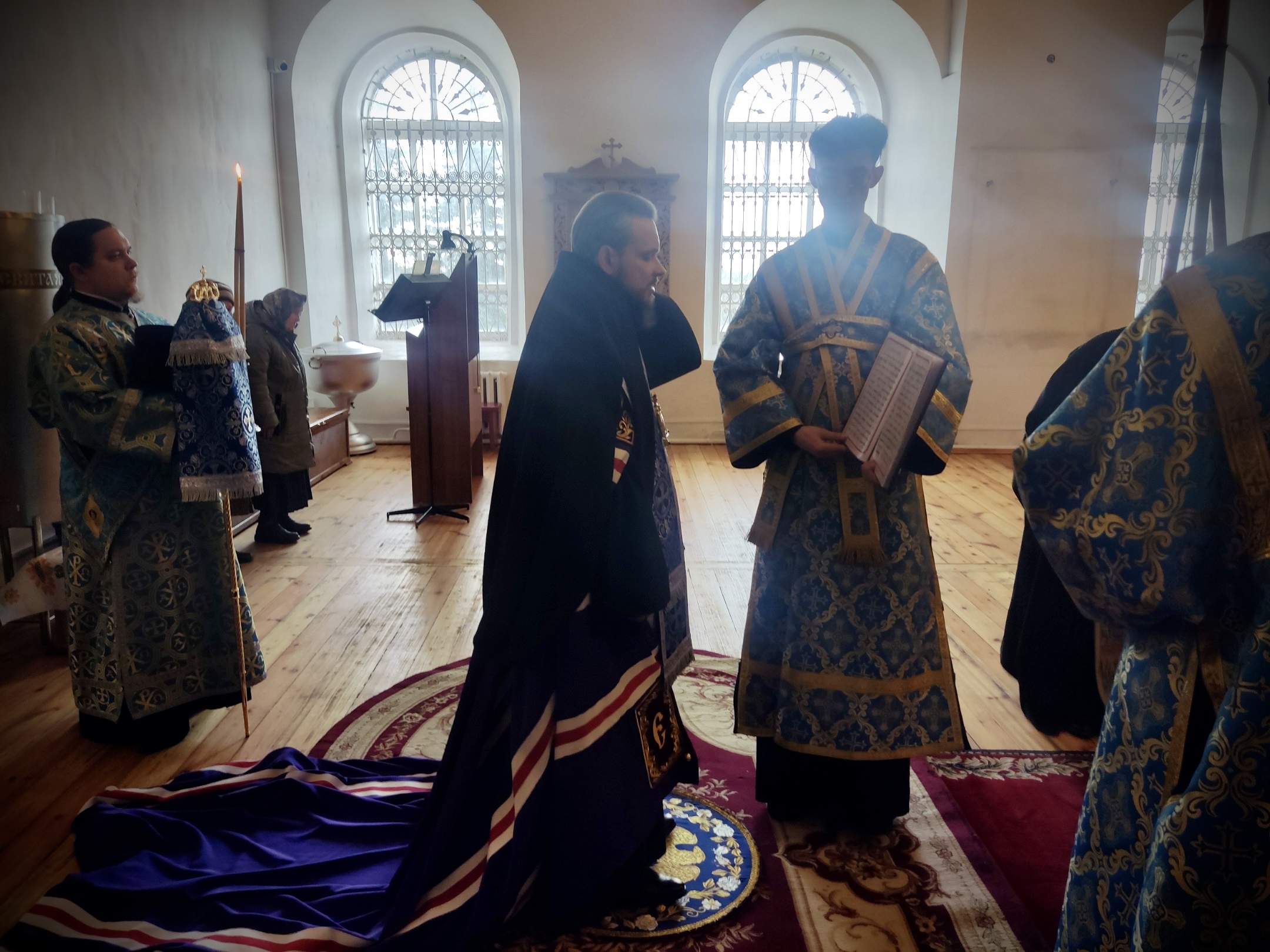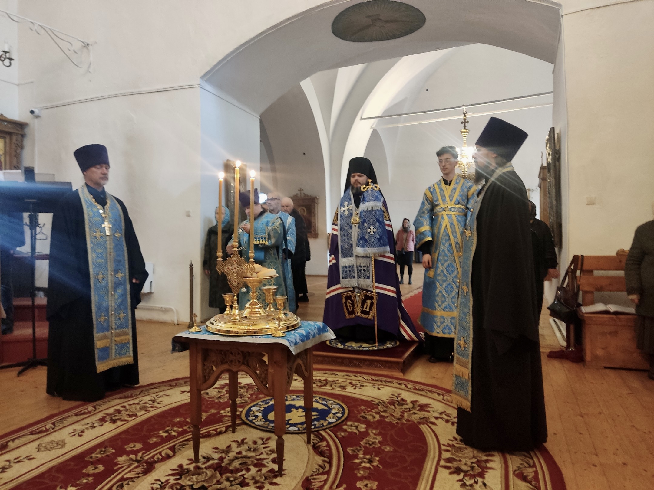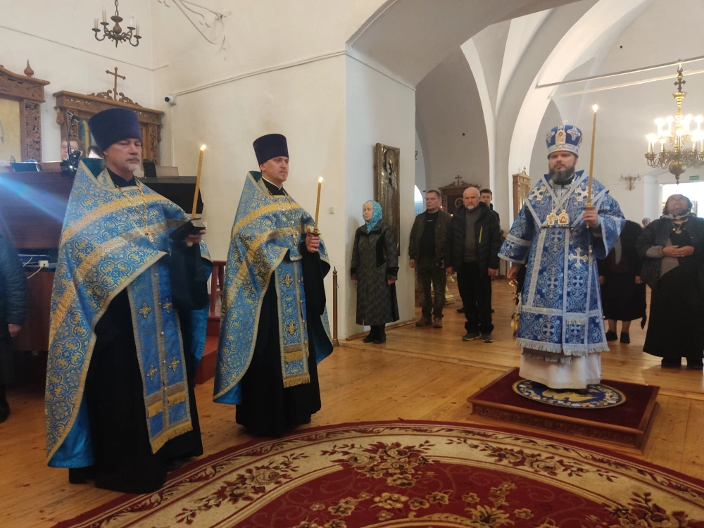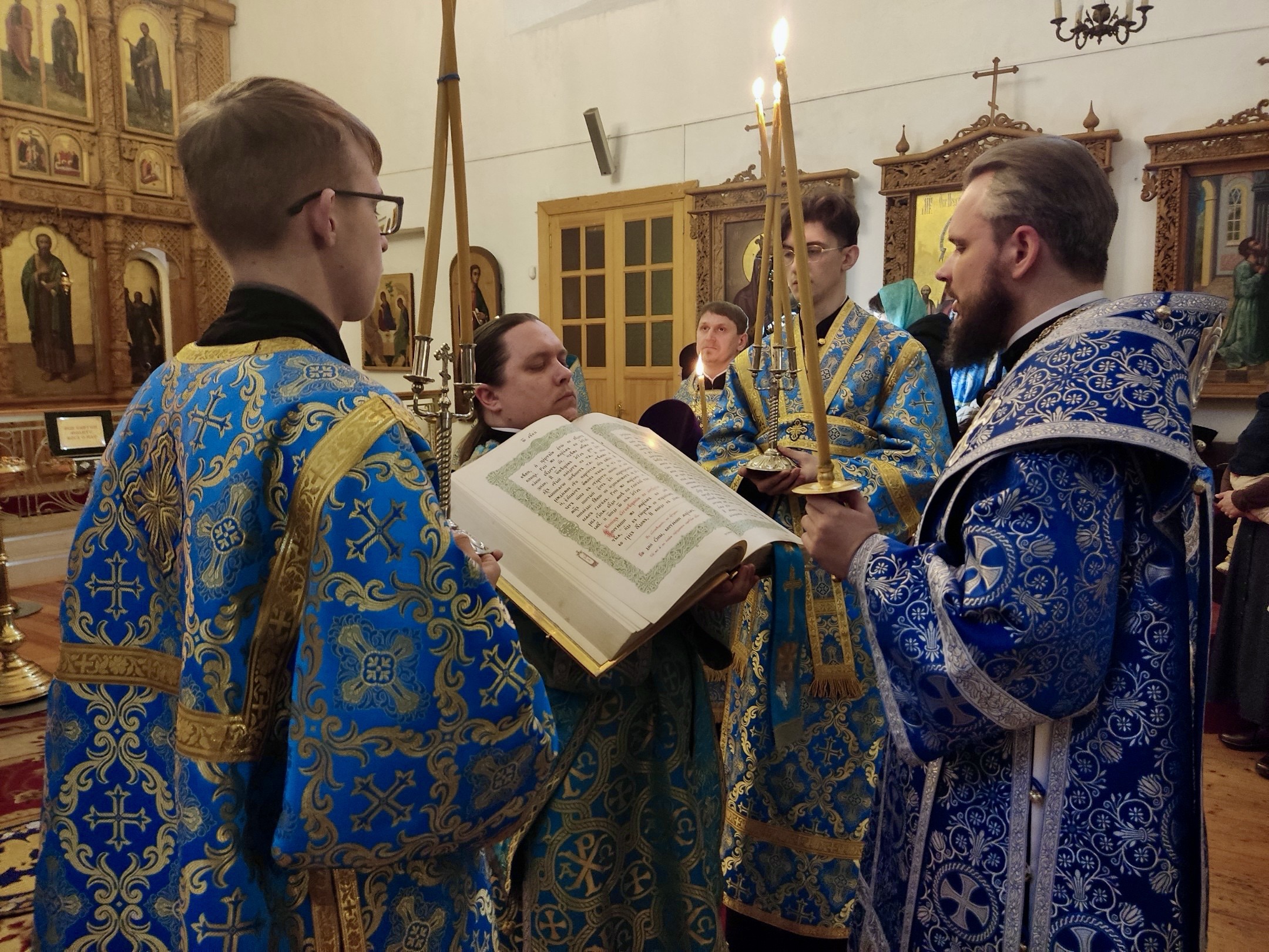 Его Преосвященству сослужили настоятель собора иерей Павел Тарасов, иерей Александр Курмелев, иерей Владимир Покатов, иерей Александр Жухарев, диакон Евгений Ткач.