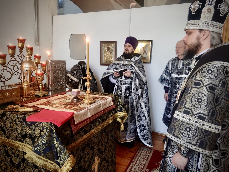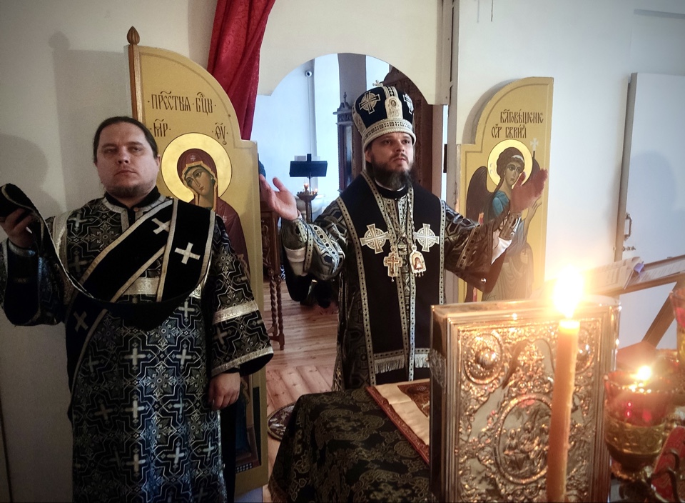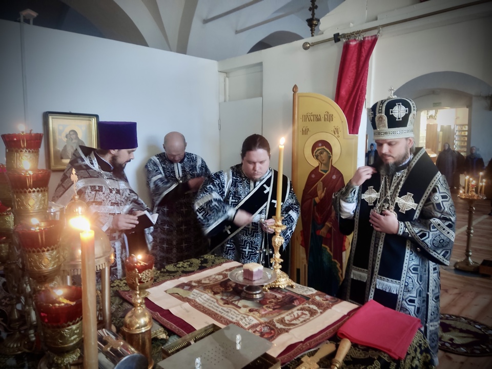 Его Преосвященству сослужили: настоятель кафедрального собора иерей Александр Курмелев, иерей Владимир Покатов, диакон Евгений Ткач.