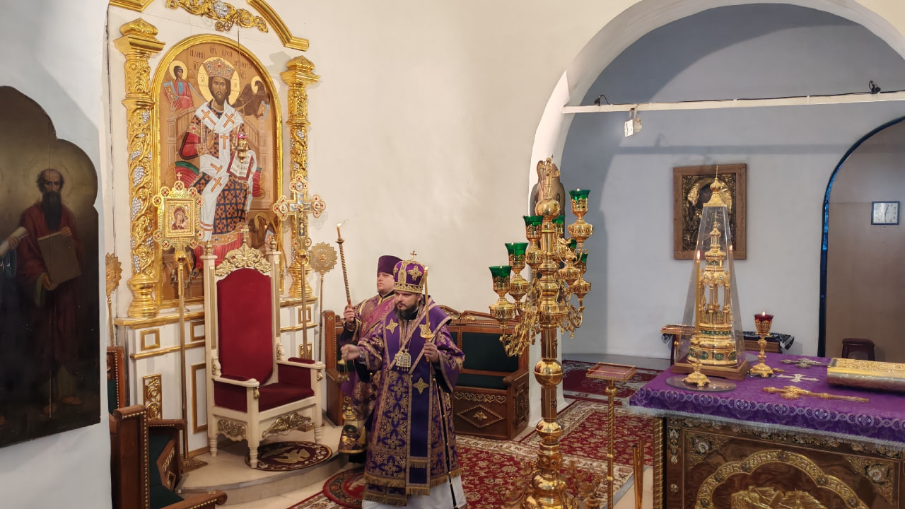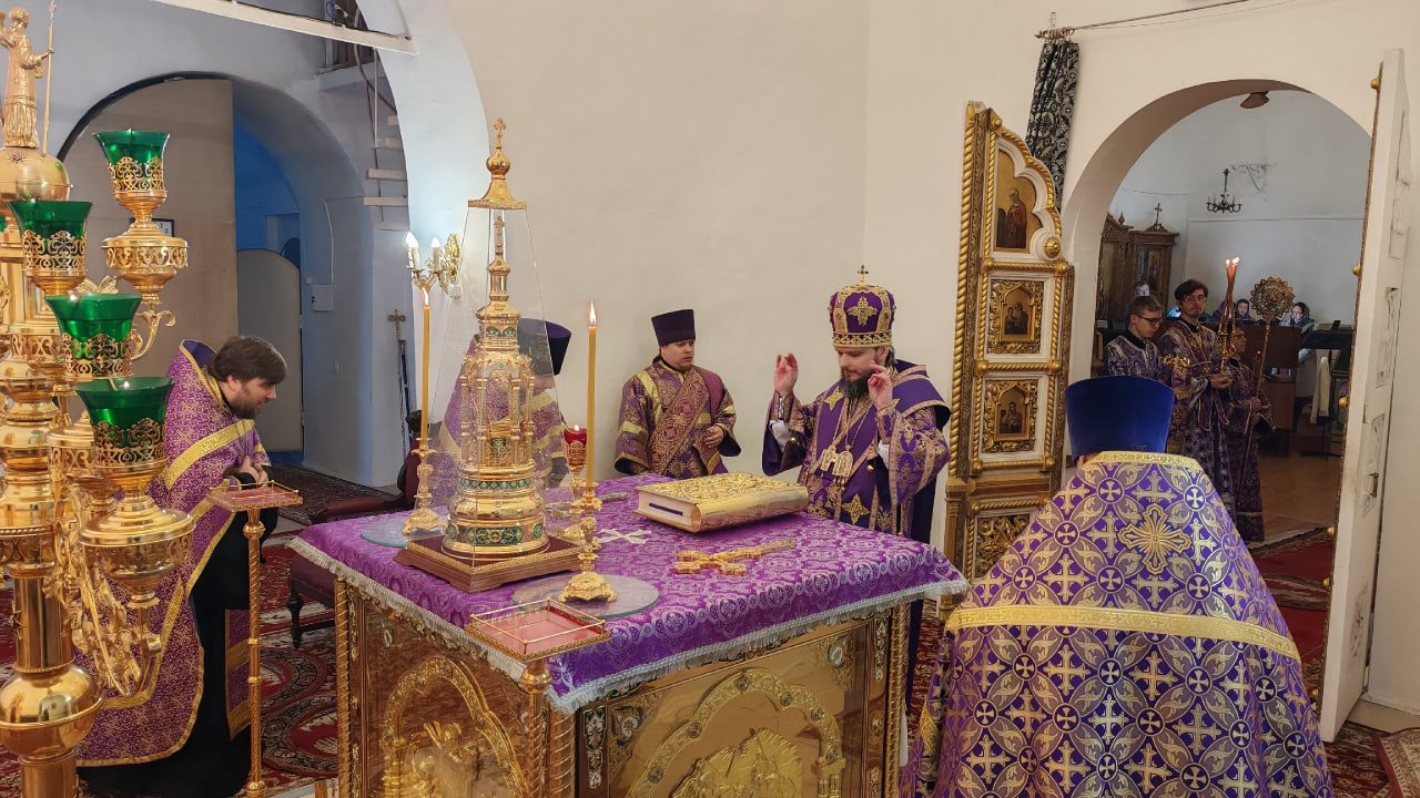 Преосвященнейшему Владыке сослужили: иерей Максим Мамонов, иерей Владимир Покатов, иерей Александр Жухарев, диакон Евгений Ткач.